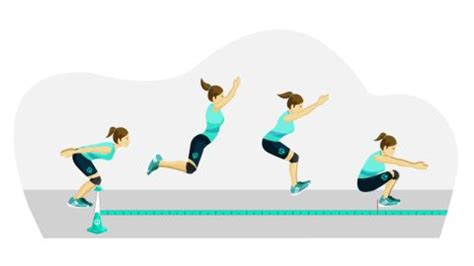 2.) tolakkan: Turunkan lengan dan ayun kebelakang, lutut ditekuk hingga setengah jongkok. Ayunkan kembali kedua lengan ke depan atas, bersamaan dengan tolakan kaki yang kuat, kepala tegak dilipat ke belakang.